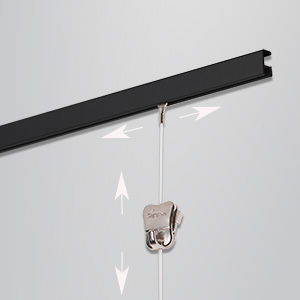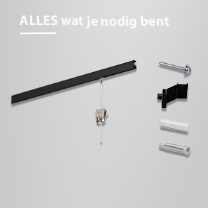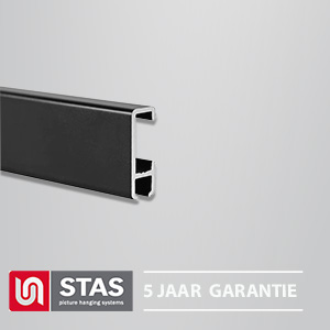 STAS Minirail™ zwart set is een uitzonderlijk smal maar sterk ophangsysteem speciaal ontworpen voor het ophangen van uw foto’s en schilderijen. Dit innovatieve systeem wordt toegepast op wanden en heeft een strak en verfijnd design. Deze SET is volledig compleet, wij hebben al het denkwerk al voor u gedaan! De elegante Minirail heeft een afmeting van slechts 9x16 mm. Daarnaast is de Minirail™ belastbaar tot wel 25 kg per strekkende meter. U klikt de Minirail eenvoudig op de wand. De combinatie van het handige perlon koord of de staalkabel met cobra, samen met de haak zipper, zorgt voor een verrassend hoge draagkracht en zorgt er daarnaast voor dat uw schilderijen of foto’s veilig aan de muur hangen.