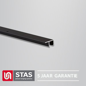 Stas U-rail zwart 300 cm is speciaal ontwikkeld om snel en eenvoudig van een systeemplafond een flexibel ophangsysteem te maken. De rail wordt bijna niet zichtbaar op de houten kantlat van het systeemplafond gemonteerd. Montage is uiterst eenvoudig door middel van speciale schroeven.Aan de schilderij rail kunt u tot wel 20 kg per m¹ aan kunst , posters of prikborden afhangen. per u-rail zwart 300 cm heeft u 24 schroeven nodig. Stas u rail zwart is belastbaar tot 25 kg per meter, voor het ophangen van u schilderij of foto`s gebruikt u de perlon koord of staalkabel met cobra en de haak zipper.